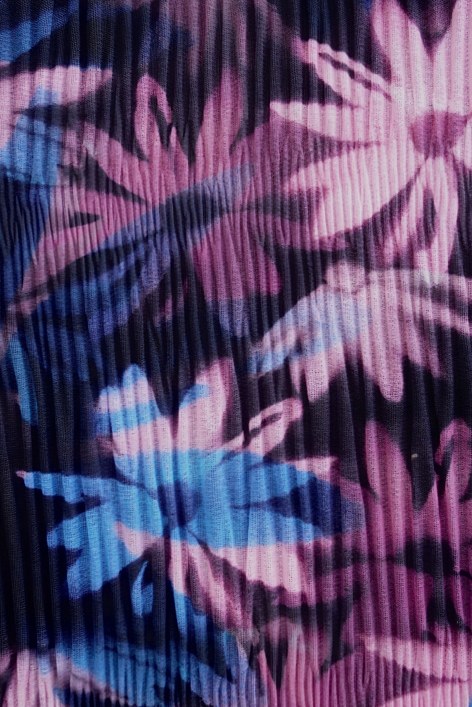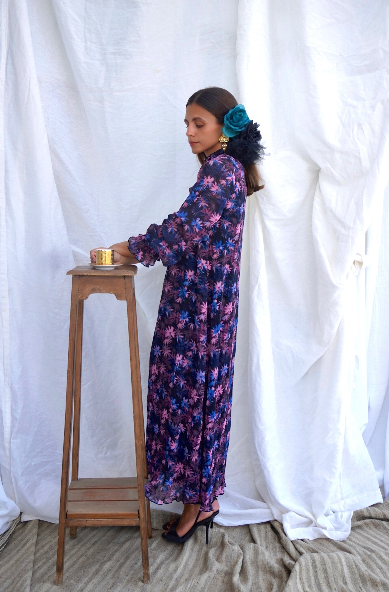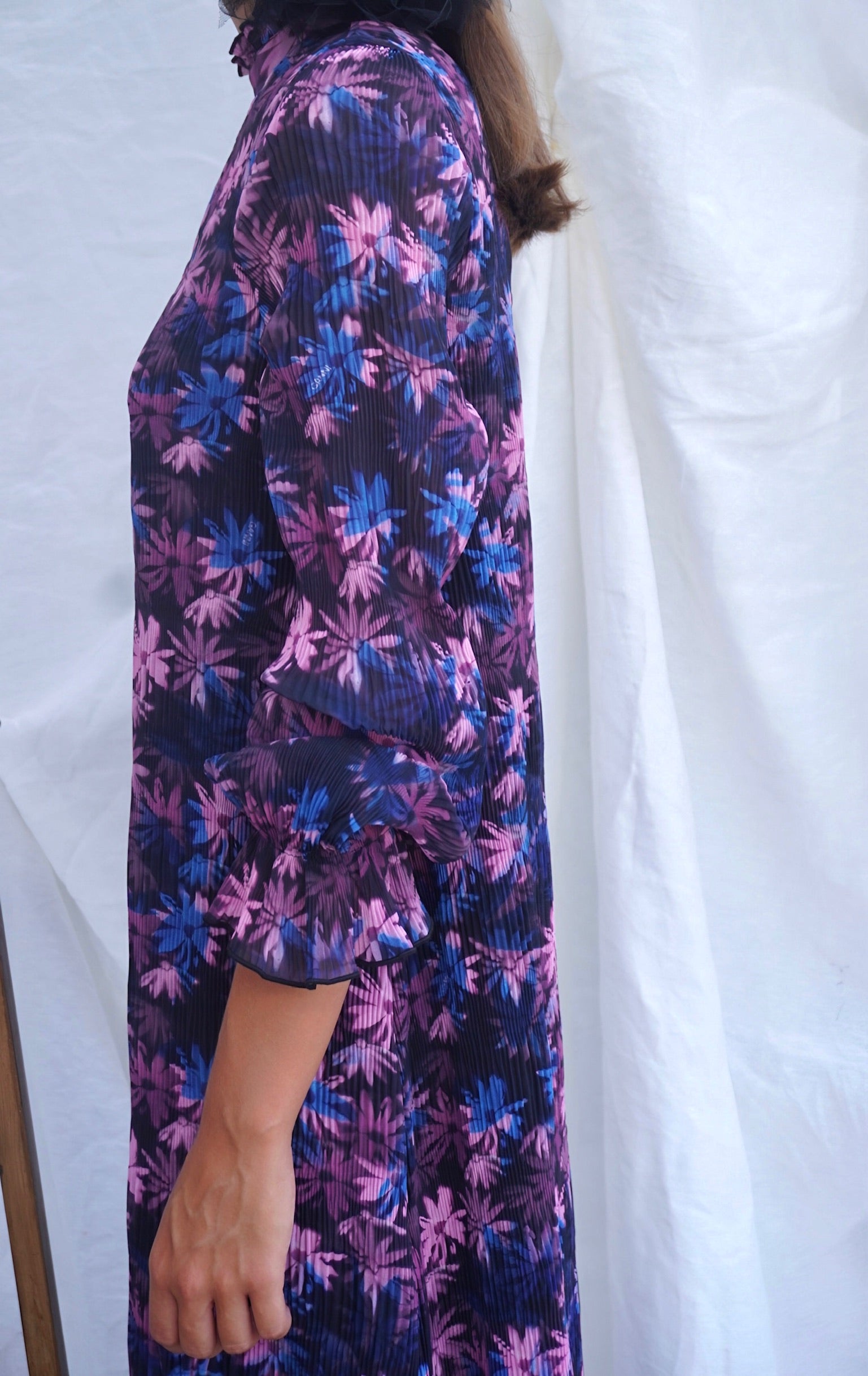 Vestido midi en georgette plisado con estampado floral en tonos azul, rosa y negro. Presenta silueta recta con caída fluida y delicados volantes en cuello y puños que aportan un aire romántico. Mangas largas abullonadas con puños elásticos. Incluye forro interior tipo slip para mayor comodidad. Cierre trasero con botón en forma de lágrima. Confeccionado en tejido ligero de peso medio, no elástico. Elaborado en 100% poliéster reciclado.