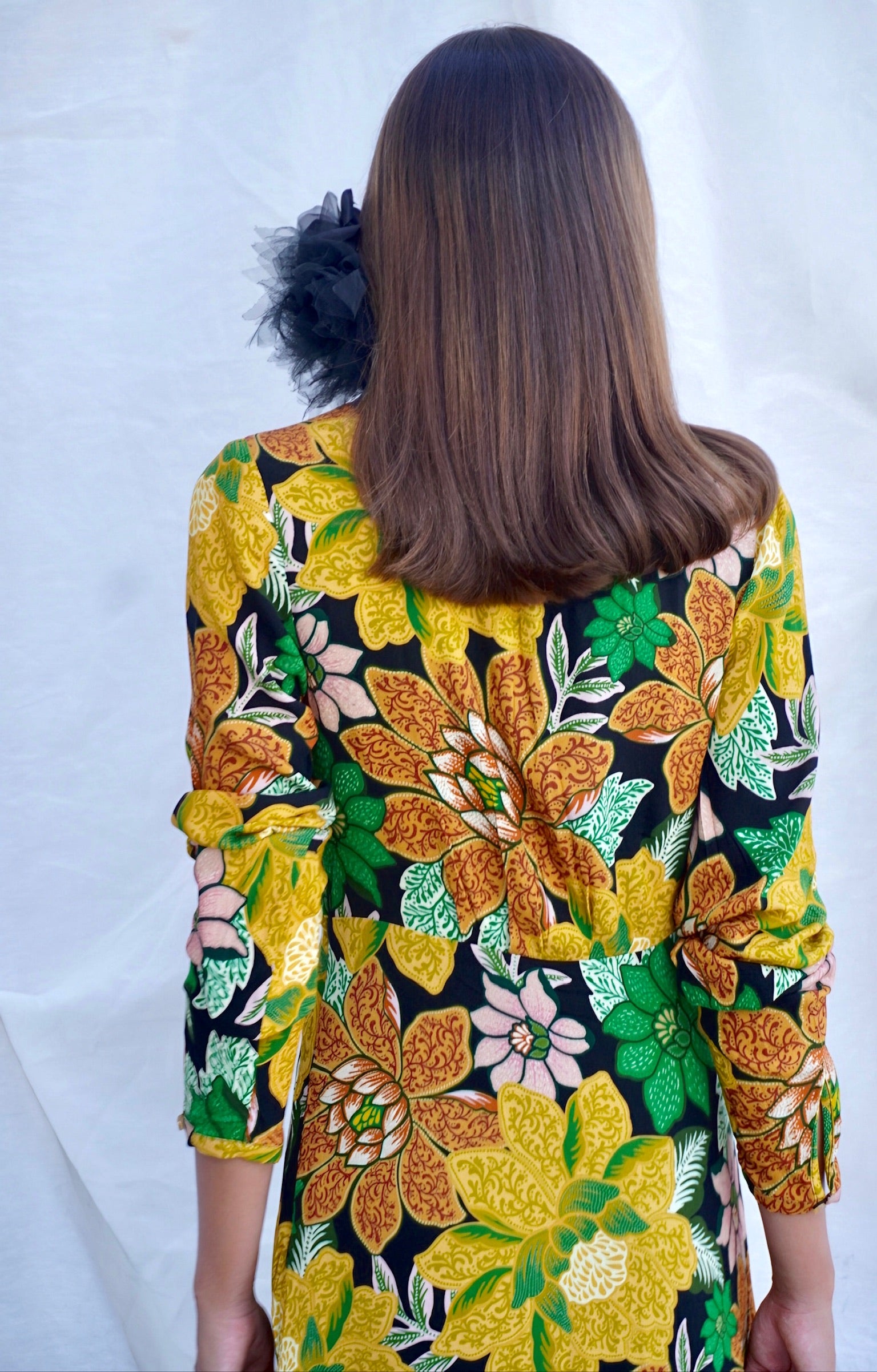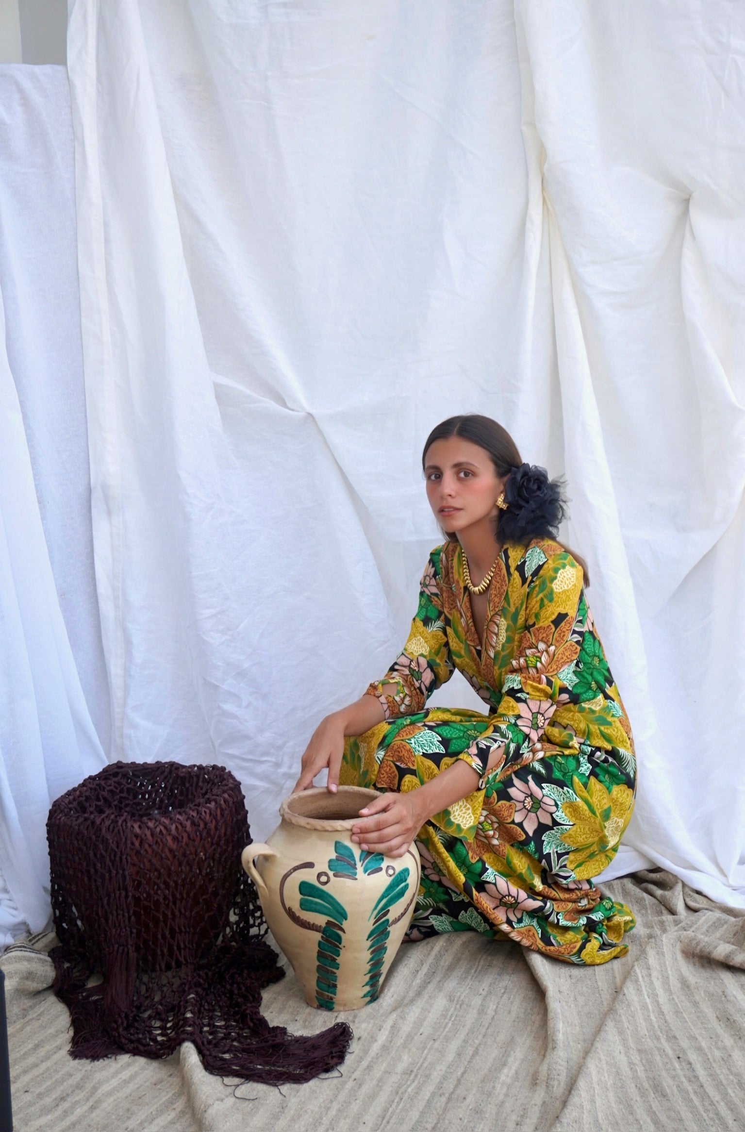 Vestido midi en crepé con estampado floral multicolor sobre fondo mostaza. Presenta efecto cruzado (wrap) que estiliza la silueta y favorece la cintura. El diseño incorpora pliegues delicados y puños abotonados que aportan un acabado sofisticado. Cuenta con forro parcial y cierre lateral con cremallera oculta. Confeccionado en tejido de peso medio, no elástico. Elaborado en 100% rayón, aporta caída fluida y un tacto ligero.