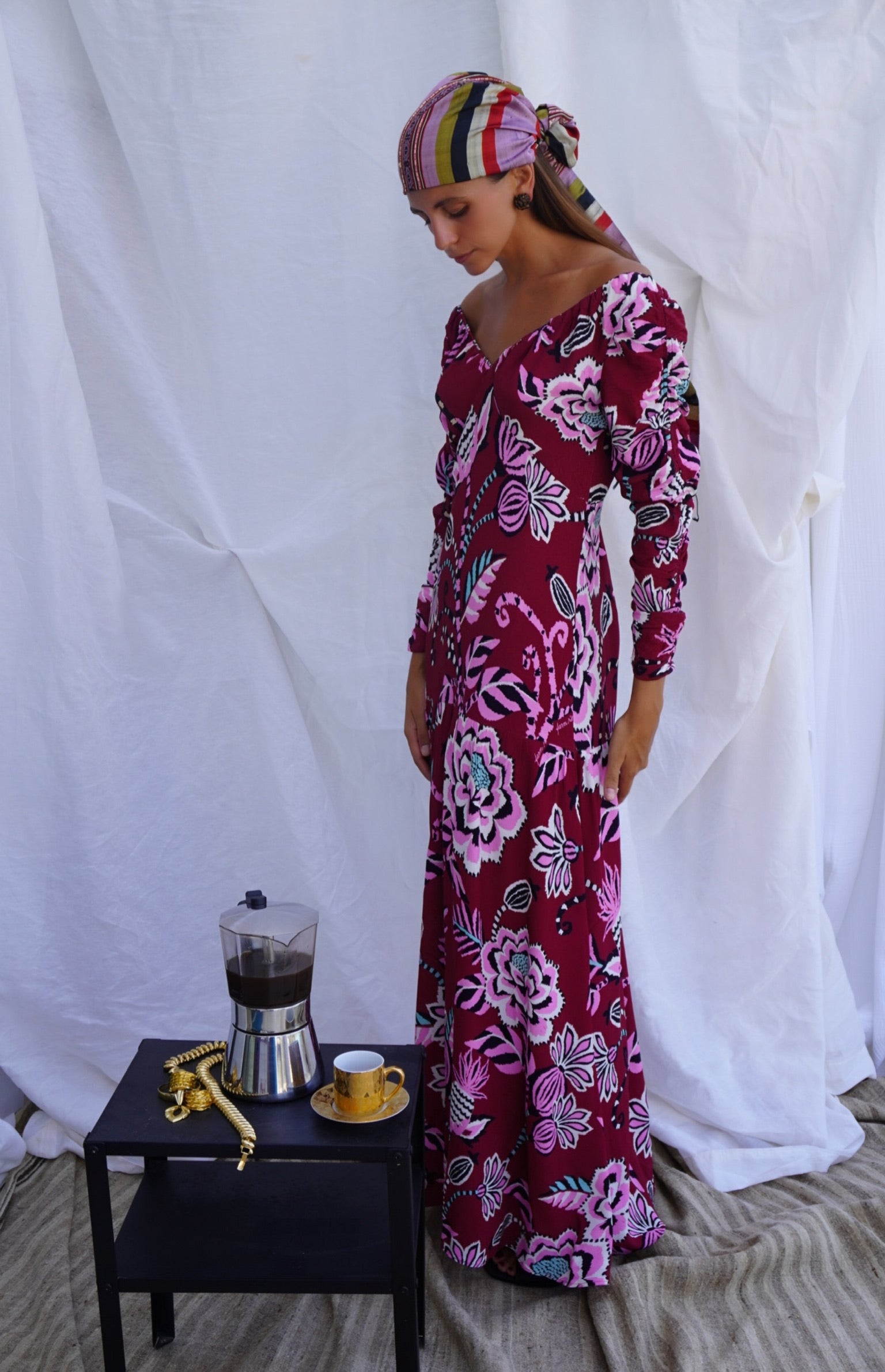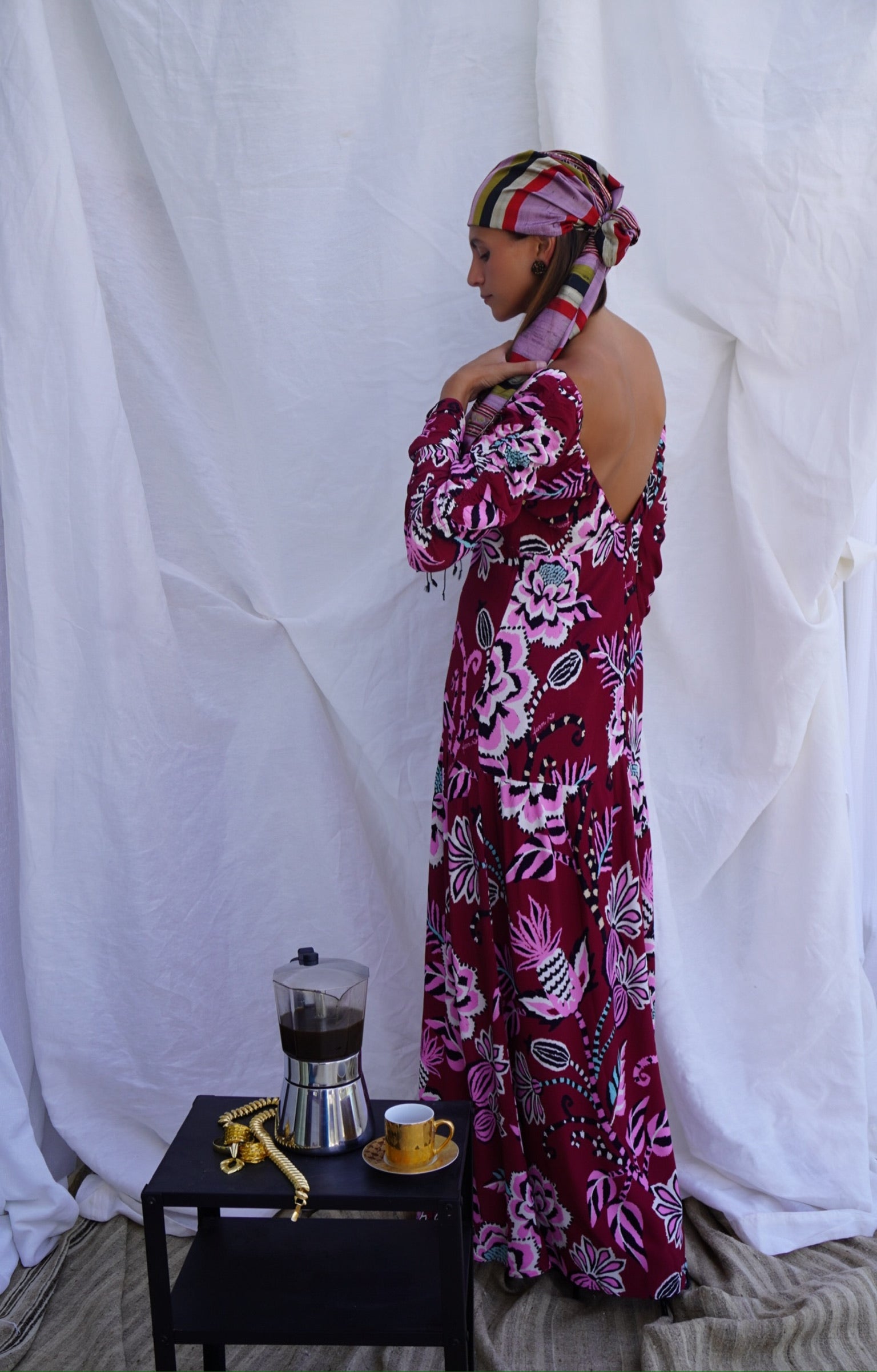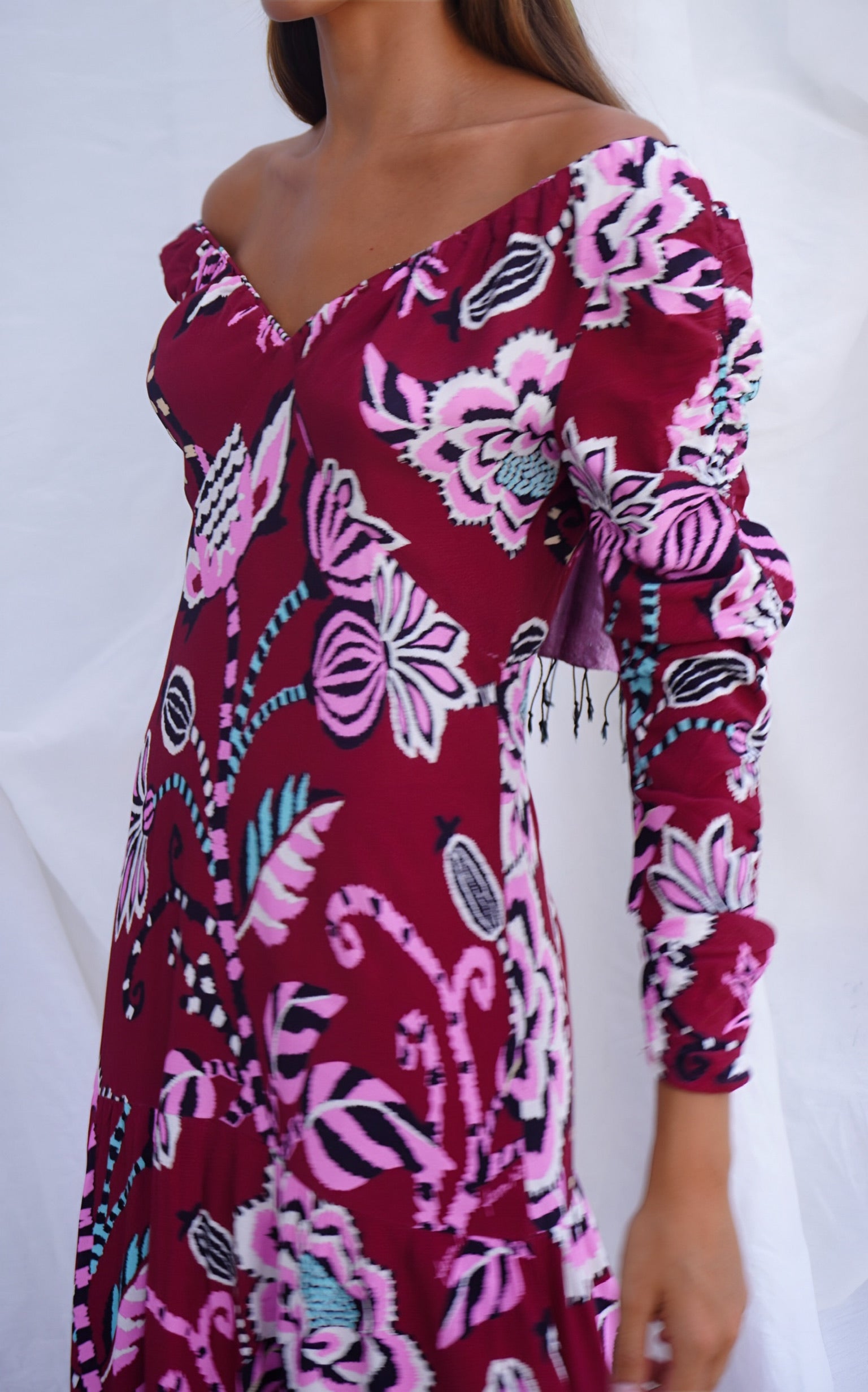 Vestido midi en crepé color burdeos con estampado floral en tonos rosas y verdes. Presenta escote en “V” y espalda abierta que aporta un aire sensual y elegante. El diseño incorpora frunces en las mangas y detalles recogidos que realzan la silueta. Mangas largas con volantes sutiles y corte fluido en la falda. Confeccionado en tejido de peso medio, no elástico, parcialmente forrado. Elaborado en 100% viscosa.