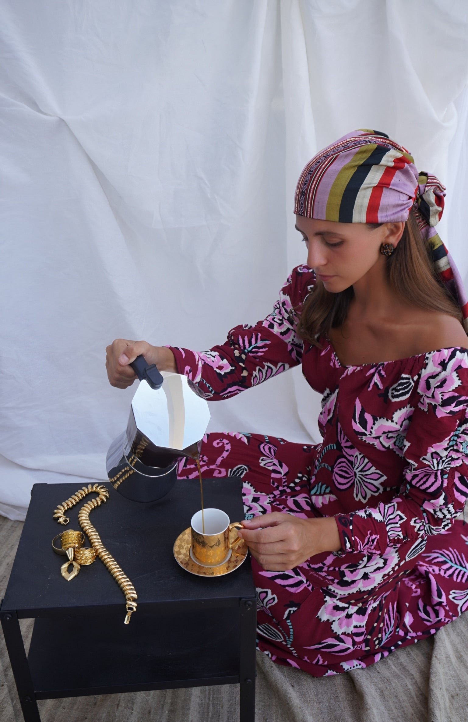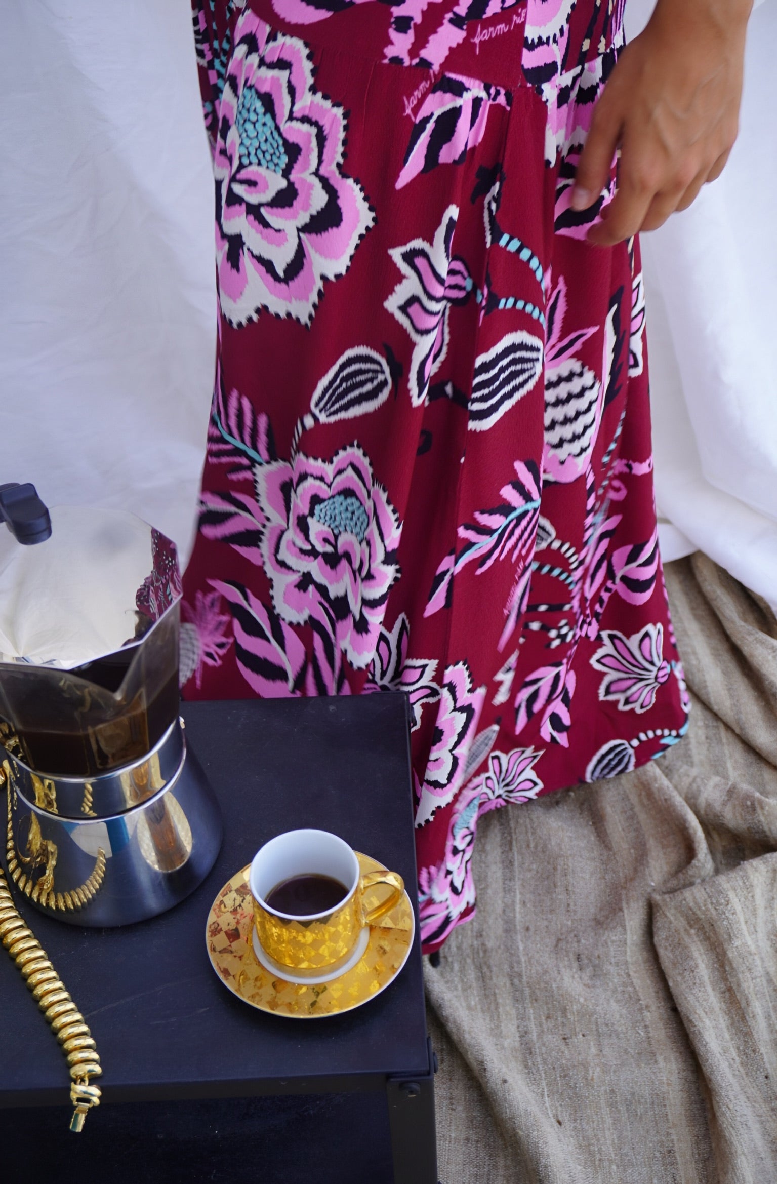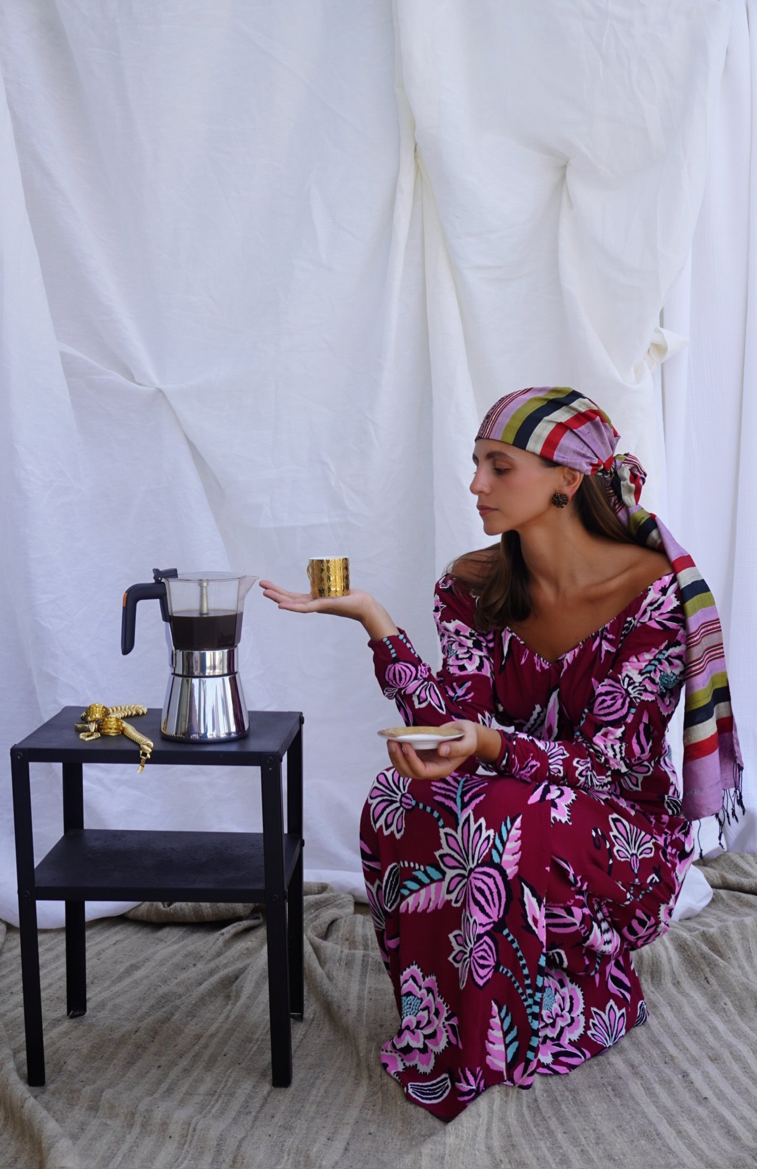 Vestido midi en crepé color burdeos con estampado floral en tonos rosas y verdes. Presenta escote en “V” y espalda abierta que aporta un aire sensual y elegante. El diseño incorpora frunces en las mangas y detalles recogidos que realzan la silueta. Mangas largas con volantes sutiles y corte fluido en la falda. Confeccionado en tejido de peso medio, no elástico, parcialmente forrado. Elaborado en 100% viscosa.