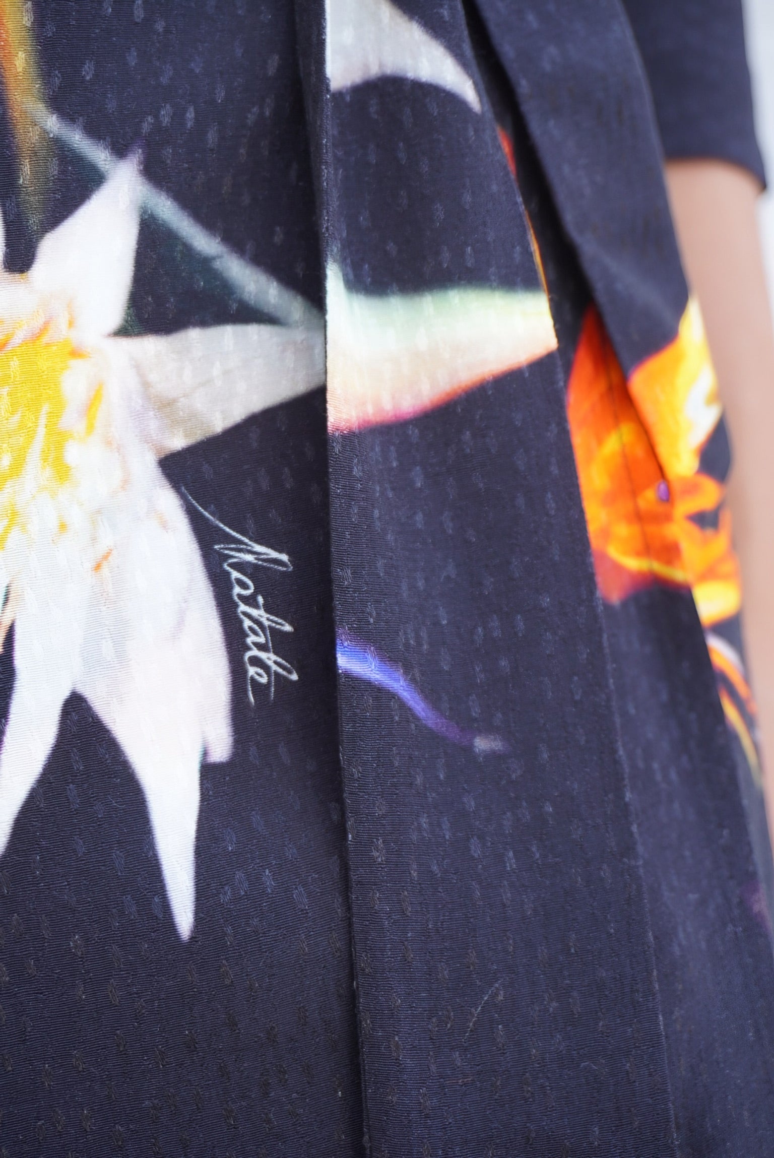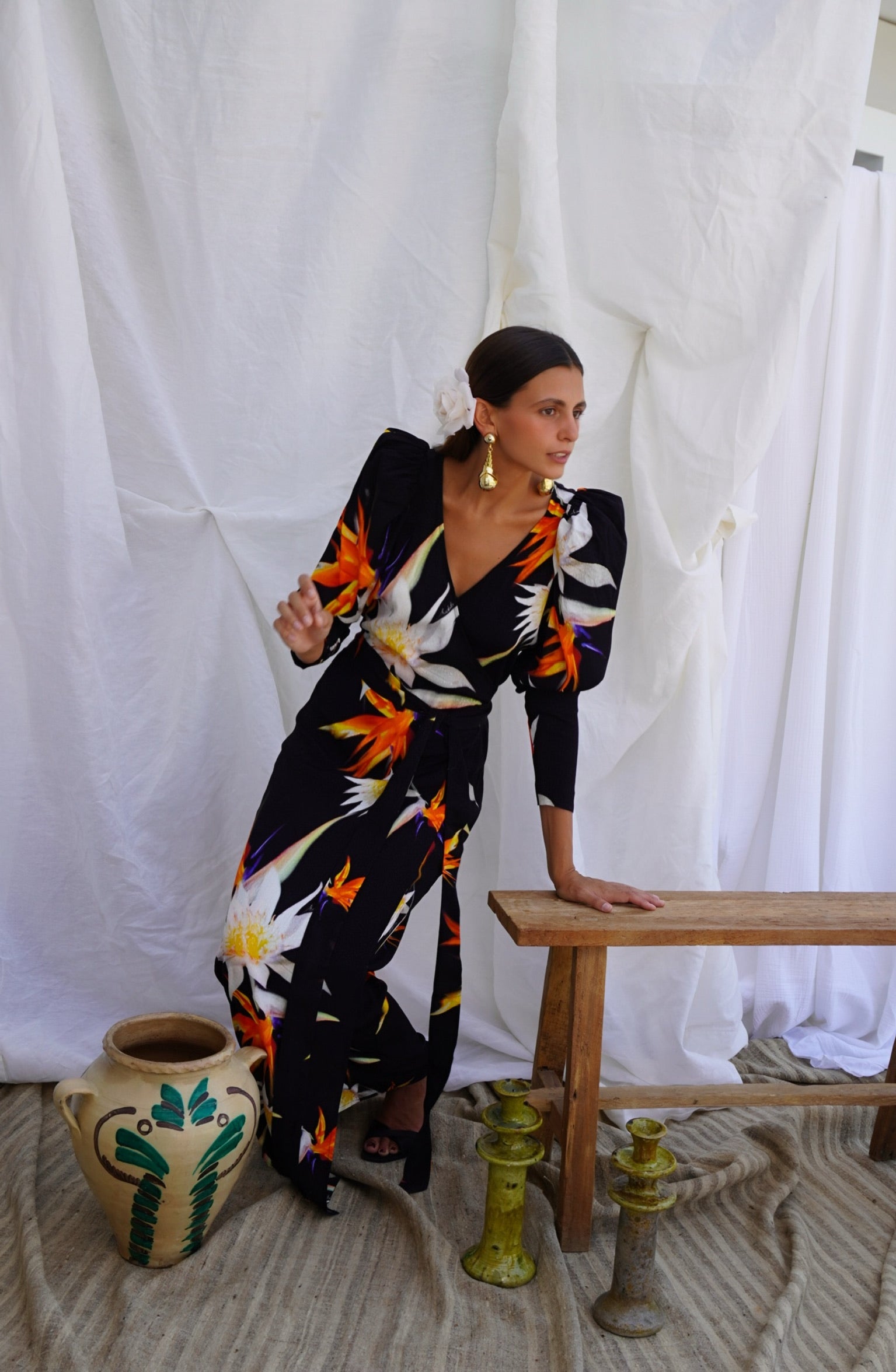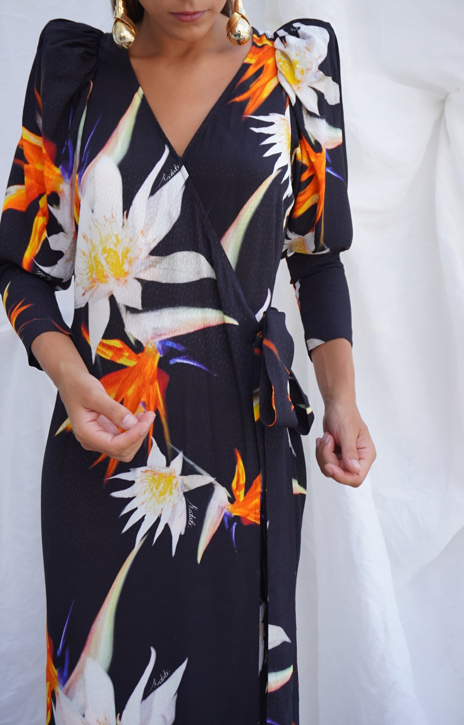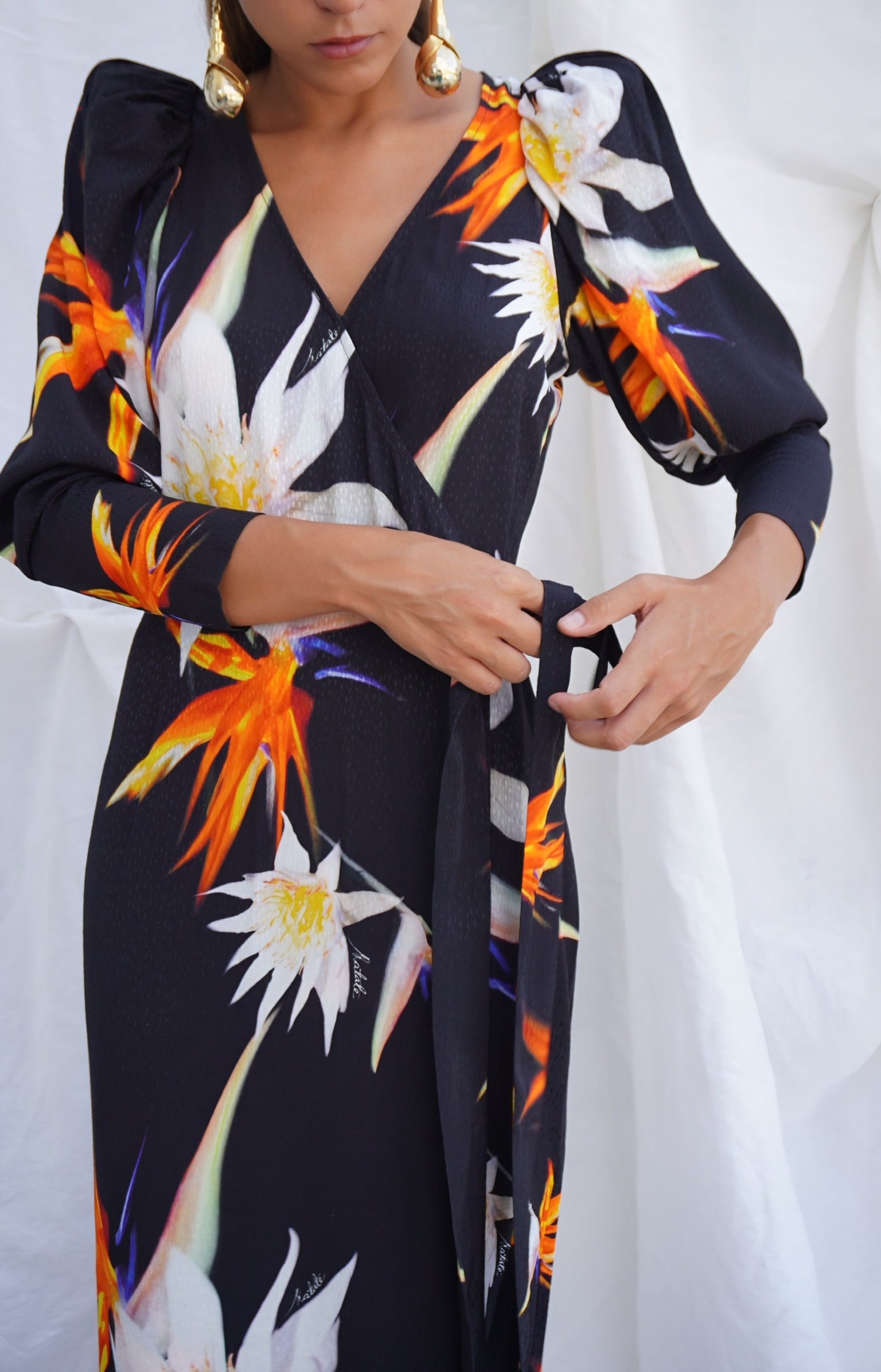 Vestido midi cruzado confeccionado en satén jacquard con estampado floral en tonos vivos sobre fondo negro. Presenta un diseño elegante con hombreras exageradas que realzan la silueta y lazada en la cintura que define la figura. Incluye cierre delantero oculto para un acabado pulido. El tejido, de peso medio y sin elasticidad, aporta estructura y caída refinada. Elaborado en 100% viscosa.